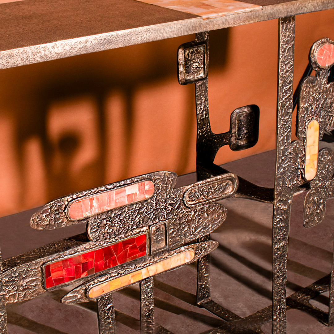 Stone Inlay – Fine stones are carefully embedded into brass surfaces, introducing subtle accents of colour and luxury that enhance the narrative of material contrast.