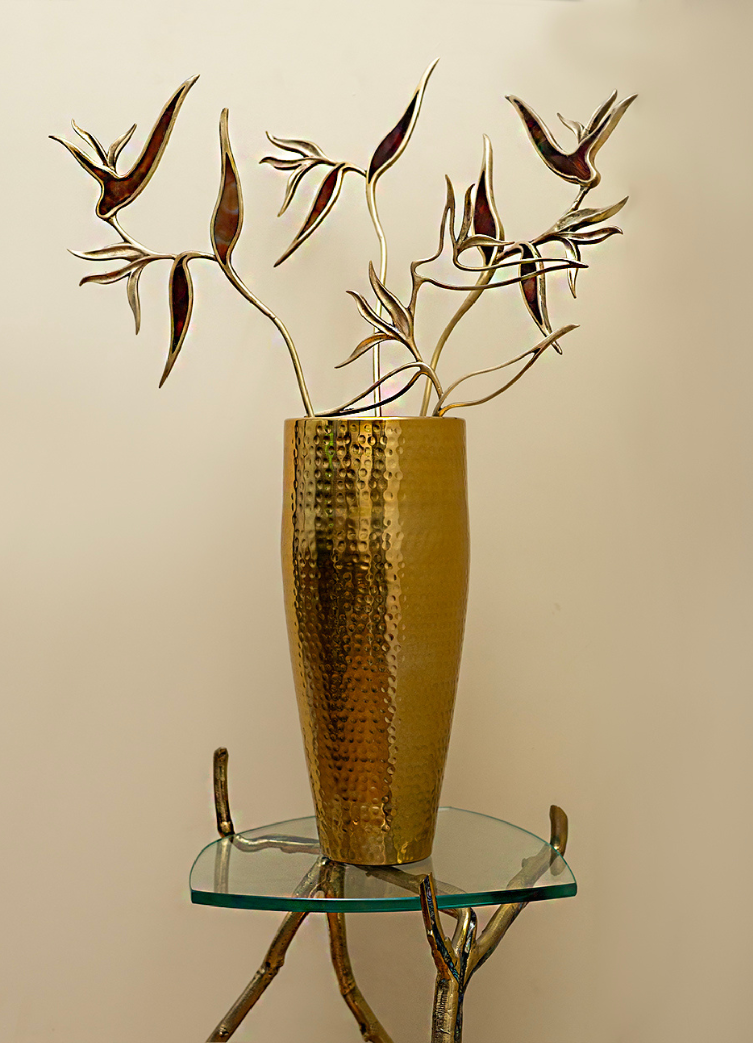 Repoussé – The brass is shaped from the reverse side to create intricate, raised forms. This technique allows the metal to flow organically, giving each piece sculptural depth and softness.