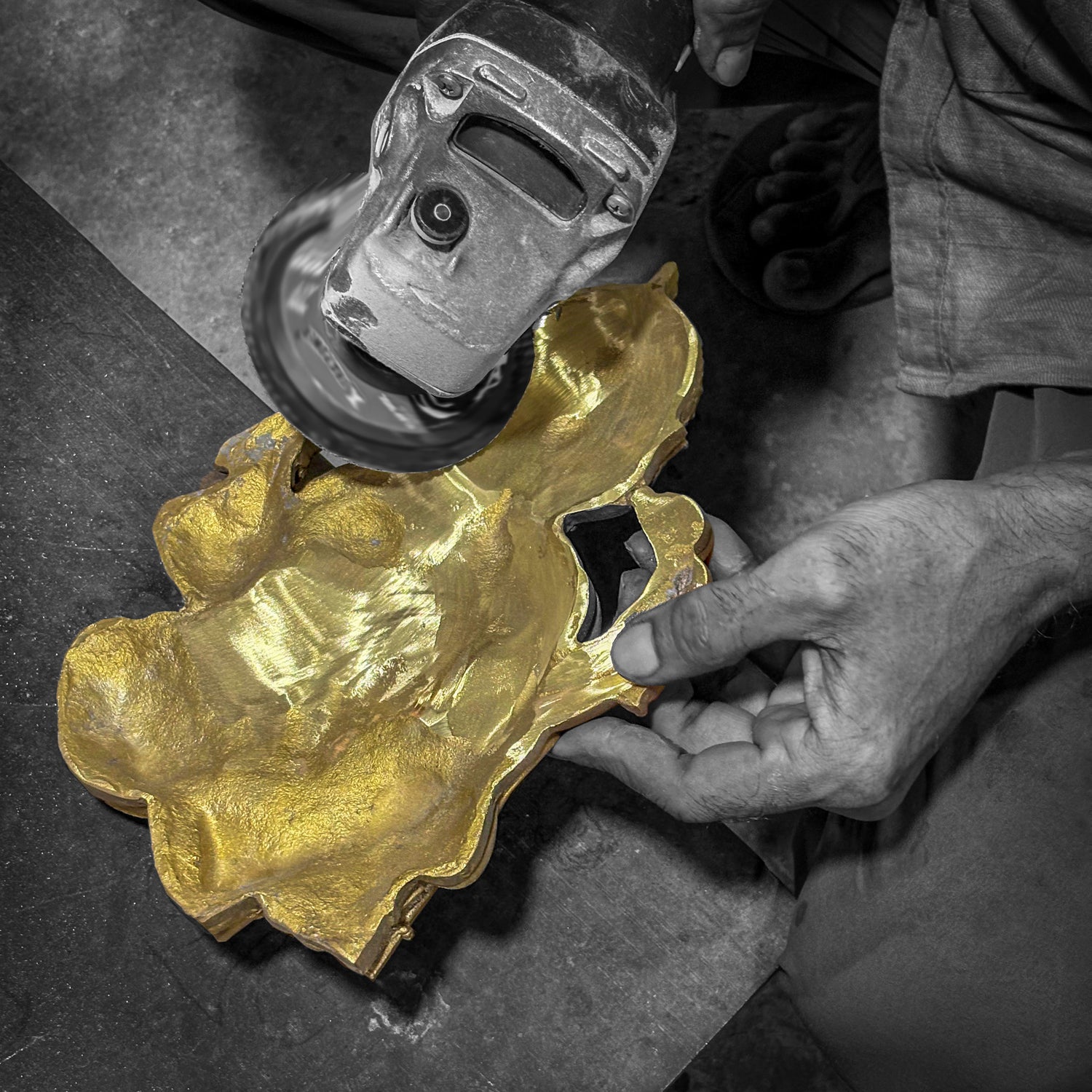 Casting – Molten brass is poured into moulds to form fluid, sculptural shapes that capture both organic and architectural inspirations, embodying Anom’s sense of movement and balance.