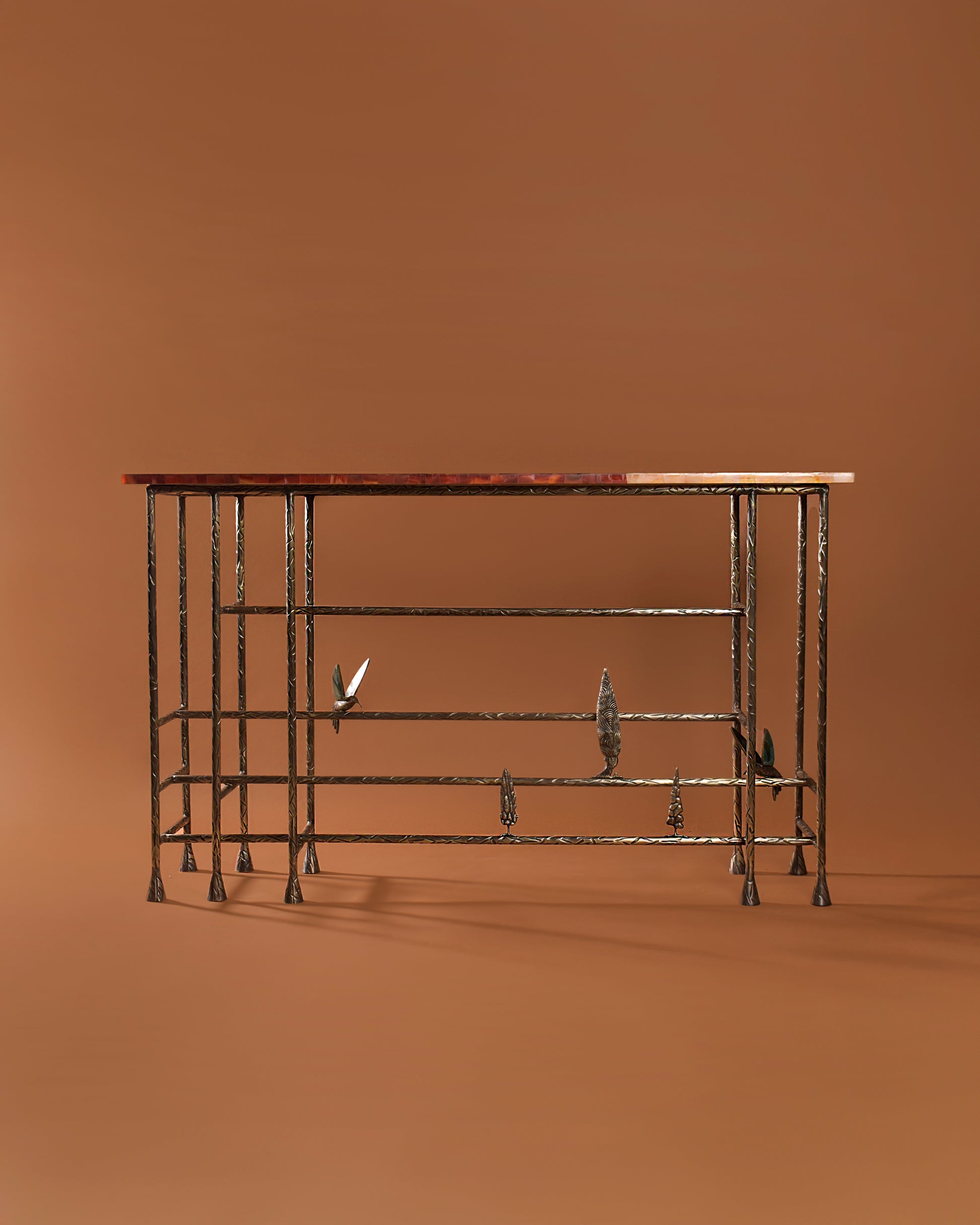The Oracle Console is a sculptural statement piece where geometry, nature, and surrealism converge in quiet opulence. Its metal base rises like an abstracted grove - linear, architectural, and rhythmically arranged, yet softened by organic interventions of perched birds and tapering tree forms. This interplay of the structured and the wild creates a landscape suspended in metal.