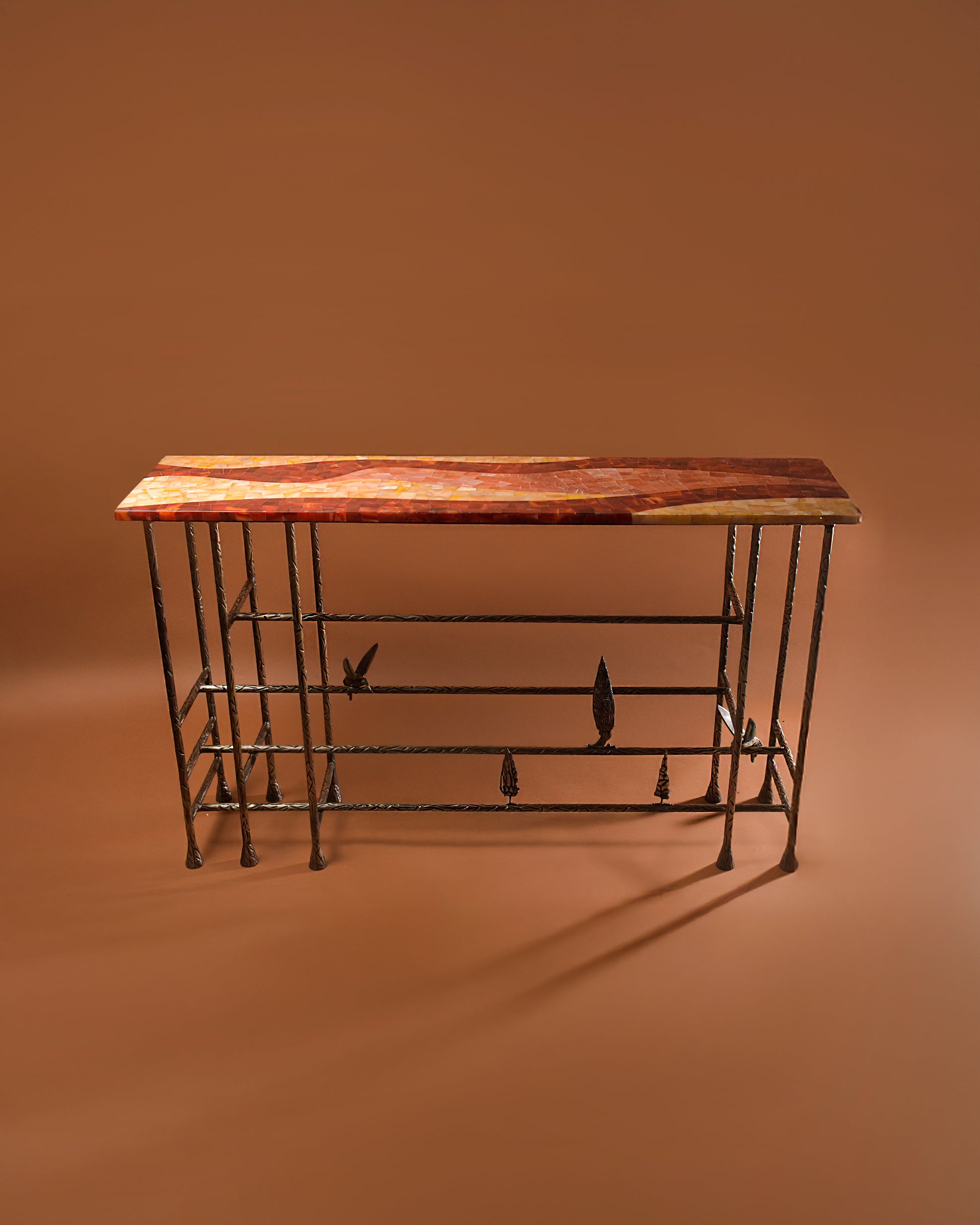 The console embodies a curated tension: unusual elements held together by a quiet, magnetic harmony. It feels like a portal, an artefact where disparate worlds meet, and where everyday functionality is elevated into an experience of wonder and rarity.