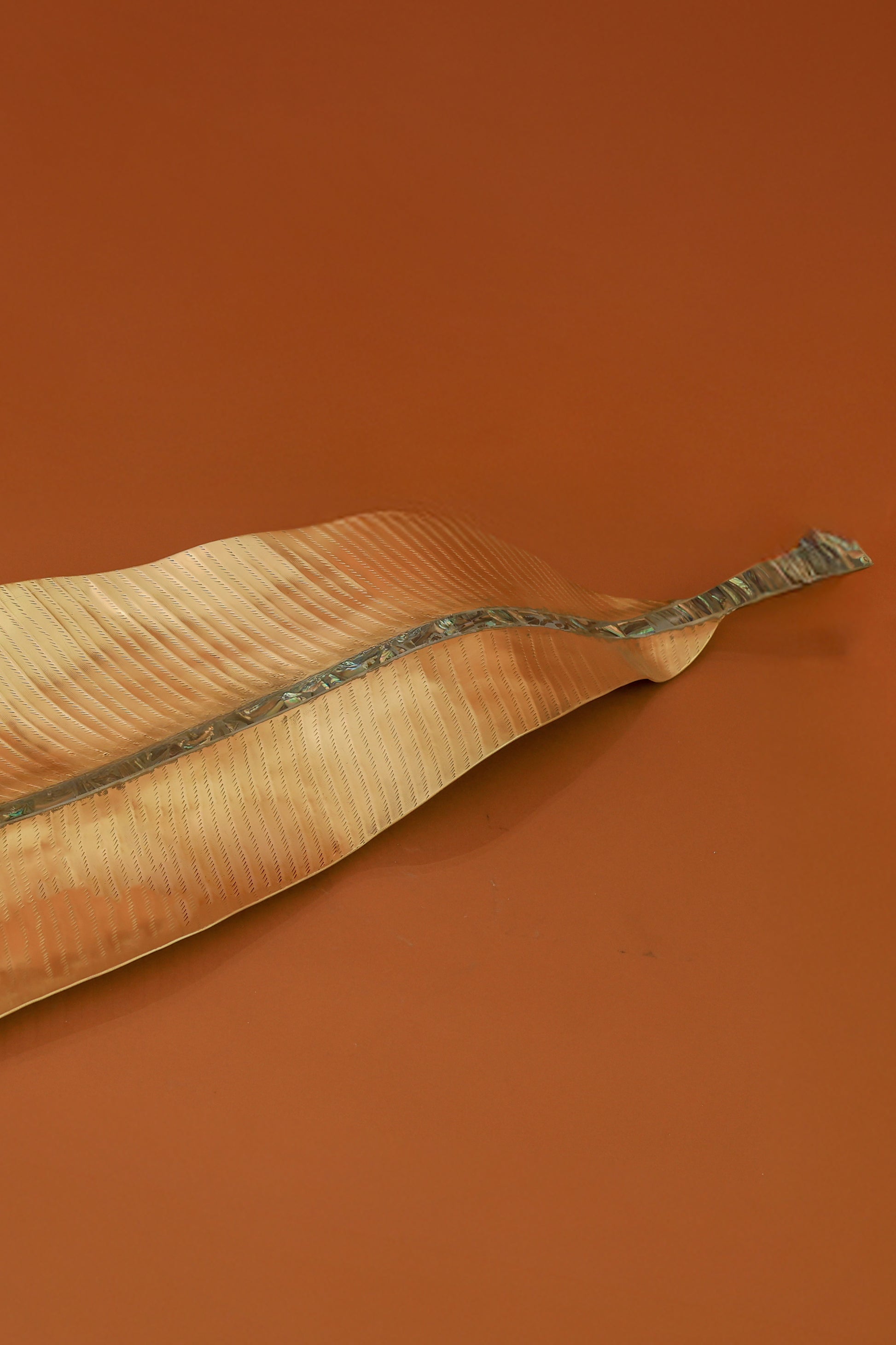A sculptural platter inspired by the organic form of a life-size banana leaf. Its sweeping curves and delicate veins are skillfully crafted using rapooze, echoing nature’s quiet rhythm. At the center, a refined stone inlay adds a touch of understated luxury, grounding the piece in balance and purity. Designed as both functional art and statement decor, it celebrates the timeless harmony between craft and nature.