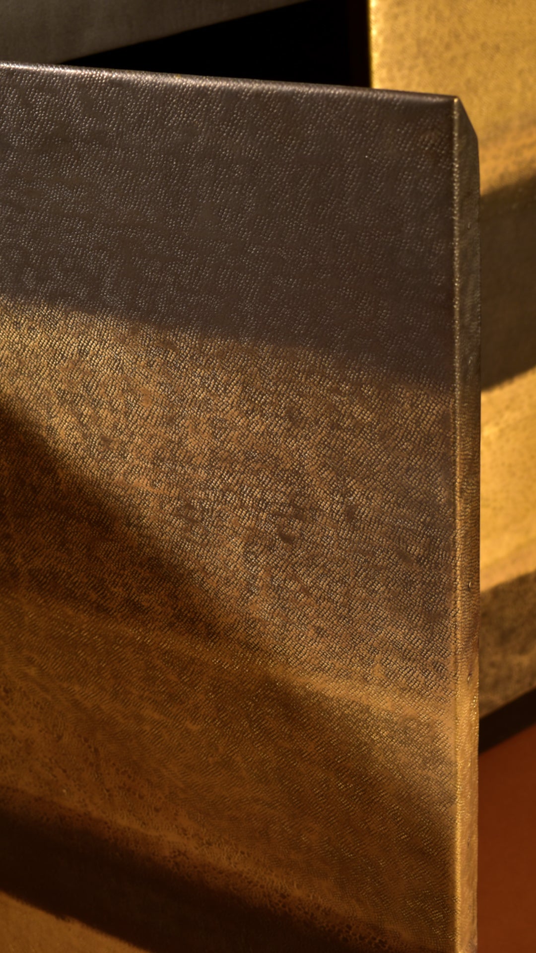 Stone Inlay – Fine stones are carefully embedded into brass surfaces, introducing subtle accents of colour and luxury that enhance the narrative of material contrast.