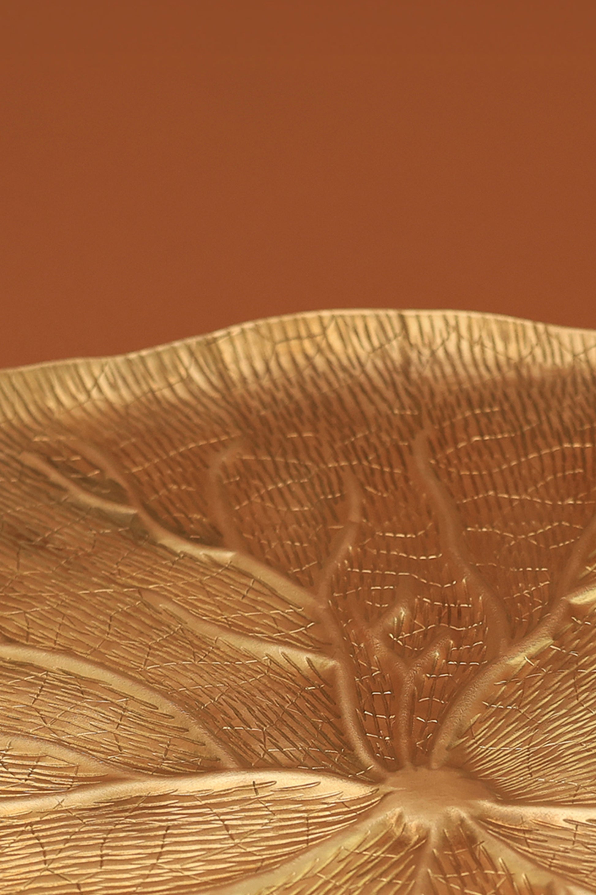 Inspired by the delicate beauty of young lotus leaves, this handcrafted brass platter features finely detailed veining across its surface. Compact yet elegant, it blends natural form with refined craftsmanship.